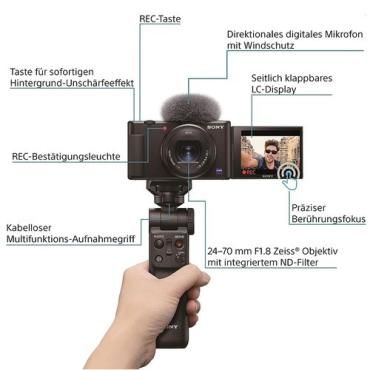 Diese Kompaktkamera macht Social-Videos mit gutem Bild und Ton – und ein Selfie-Stativ-Griff hilft dir beim Aufnehmen.
