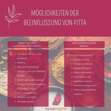 1. Hilfe bei Pitta-Überschuss Das Pitta-Dosha ist der dritte Konstitutionstyp im Ayurveda, und hier meine 1. Hilfe Tipps bei Pitta-Überschuss. Dem ...