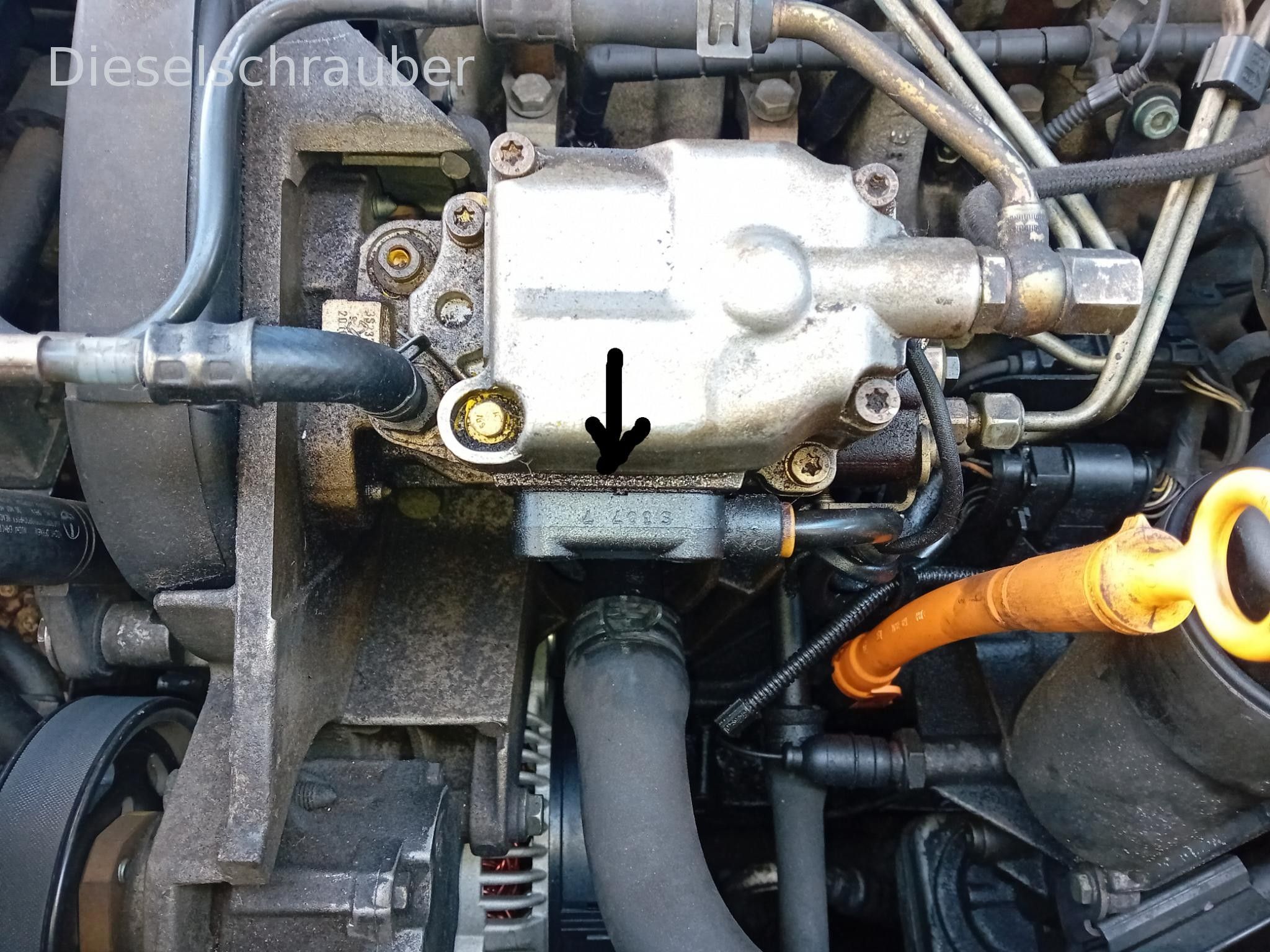 Hi! Ich hab mal ein Foto gemacht. Der Pfeil zeigt die Stelle, wo der Diesel steht und tropft.