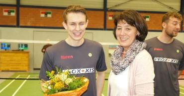 Die ehemalige Jugendwartin des STC Blau-Weiß Petra Mennekes, ehrt vor der Bundesligapartie gegen den TV Refrath 2, Niklas Niemczyk für den 3. Platz ...
