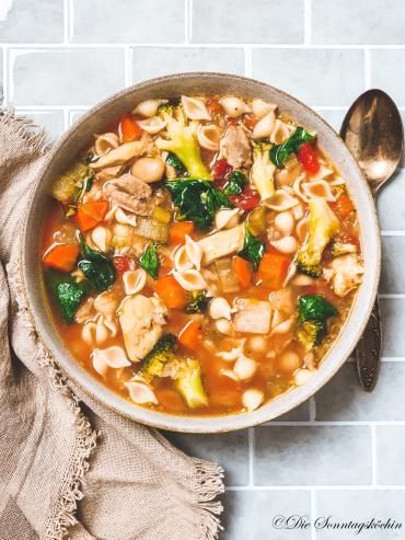 Ein Fest für alle Suppenkasper und Freunde eines guten Eintopfs. Diese Minestrone ist voll mit gutem Gemüse, Hühnerfleisch und kleinen Muschelnudeln. ...