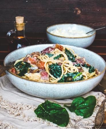 Für Pastaliebhaber gibt es heute knusprigen Bacon mit Möhren und Spinat in einer cremigen Sauce mit Spaghetti serviert. Das kann nur lecker werden. ...