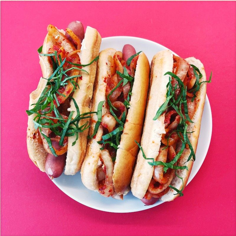 Hot Dog mit Kimchi-Zwiebeln