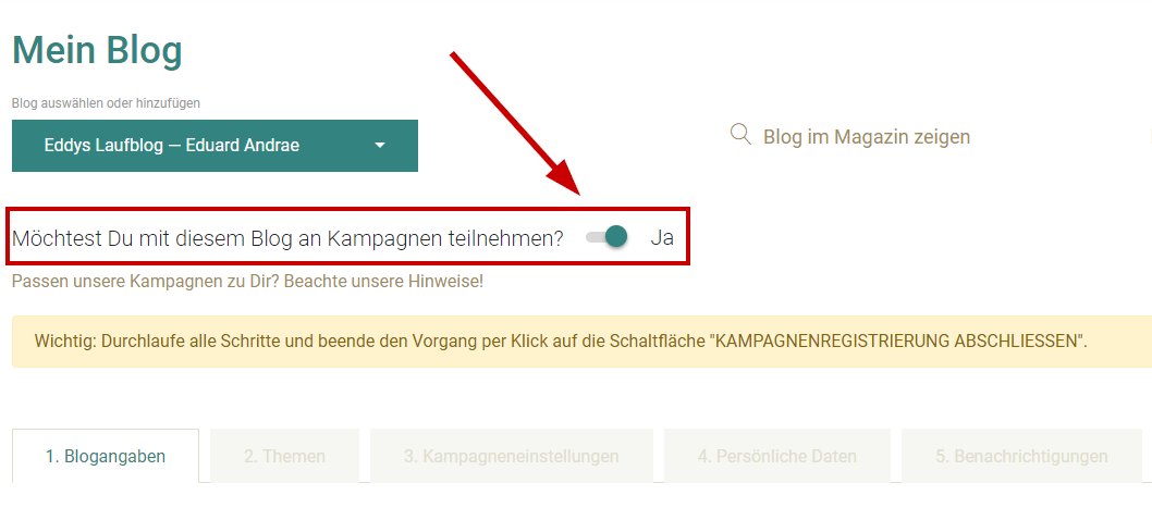 Aktiviere den Schalter zur Teilnahme an Kampagnen und vervollständige dein Profil mit den erforderlichen Informationen.